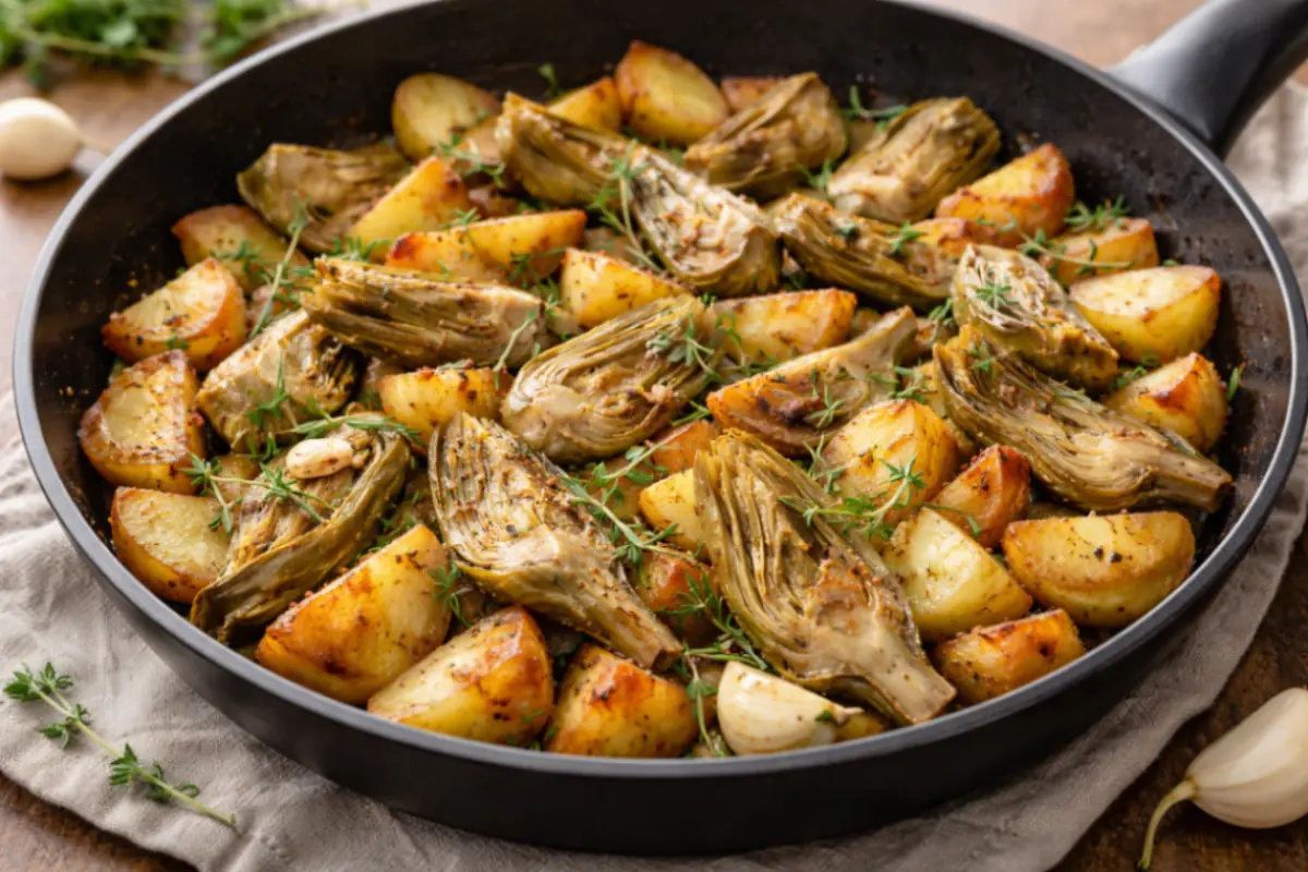Il bello di questo abbinamento è che funziona in modo naturale. I carciofi, se ben puliti e tagliati correttamente, restano teneri ma ancora presenti al morso. Le patate, soprattutto se dalla polpa soda, riescono invece a dorarsi in superficie senza disfarsi troppo durante la cottura. Insieme creano un equilibrio molto piacevole, che può essere arricchito con aglio, erbe aromatiche e una punta di paprika per dare più carattere al piatto.