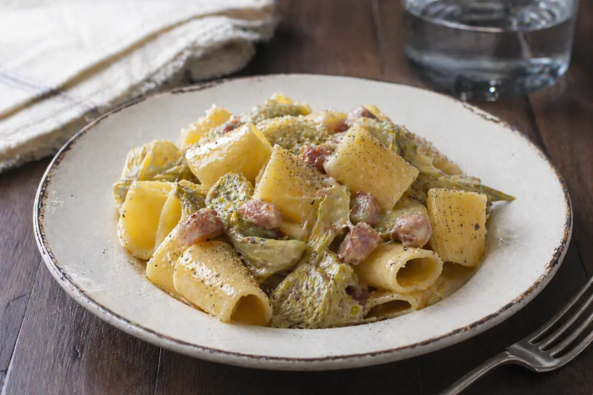 I paccheri con carciofi alla carbonara nascono proprio da questo incrocio: da una parte la cremosità intensa della tradizione romana, dall’altra un ingrediente che porta freschezza e una leggera nota amarognola. Non è una variante “leggera”, ma è una versione che cambia ritmo rispetto alla carbonara classica.