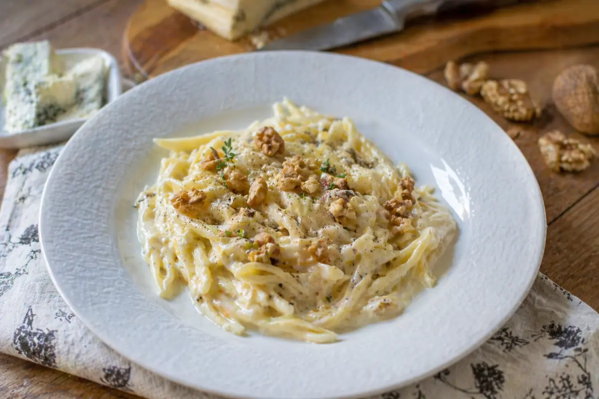 Il protagonista è il gorgonzola, un formaggio che divide. Il suo sapore intenso non lascia spazio a mezze misure, e proprio per questo crea un contrasto interessante con la dolcezza della panna e la nota più asciutta delle noci.
